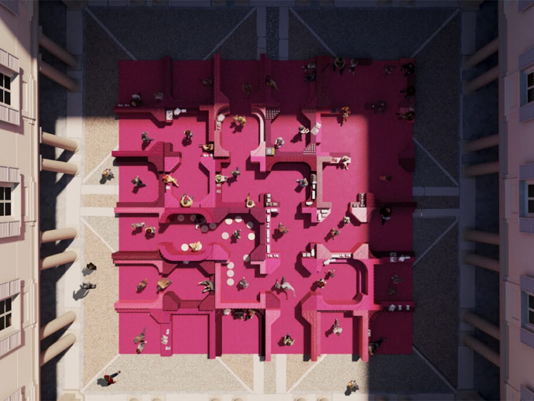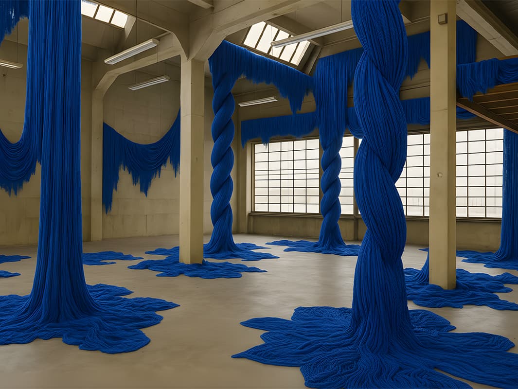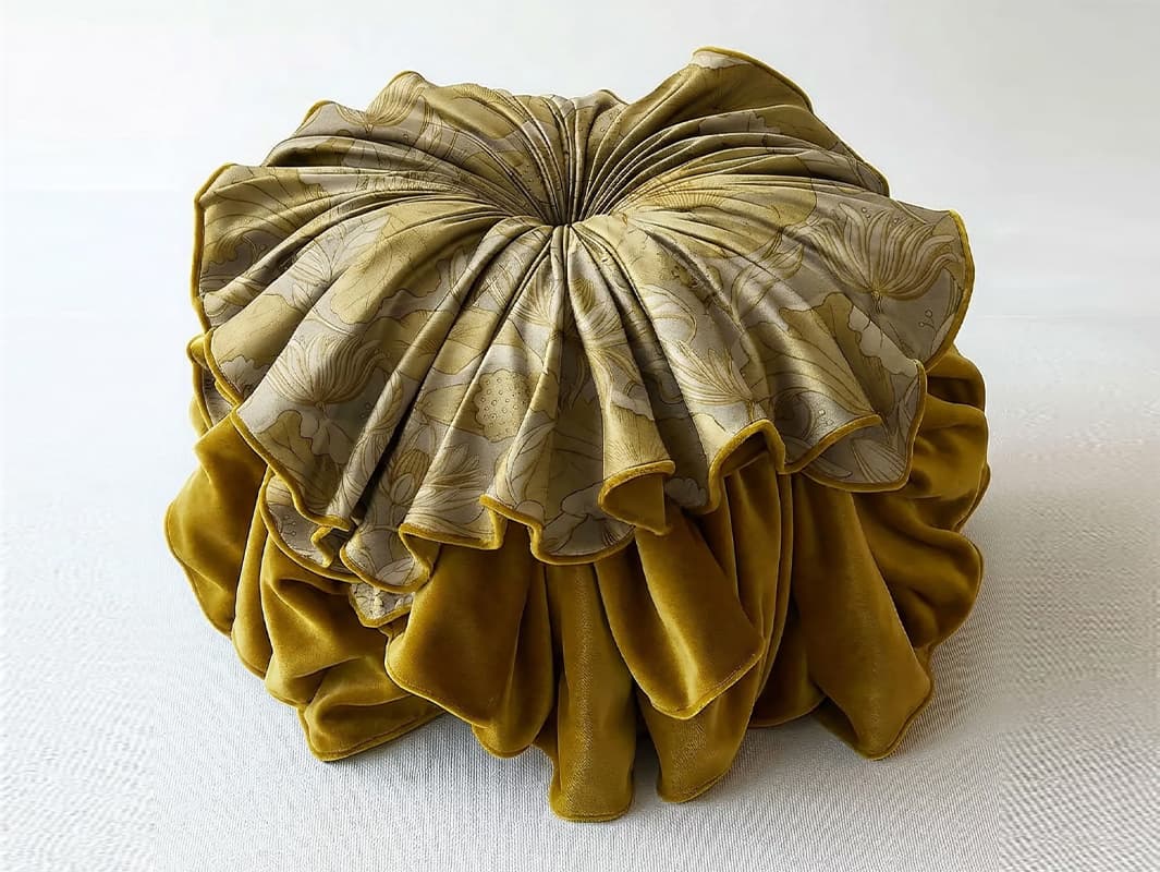 Центральный элемент – круговой диван, полностью собранный из подушек, который работает как архитектурная форма. Инсталляция размывает границу между поверхностью и объемом, предлагая рассматривать текстиль не как декор, а как конструкцию.