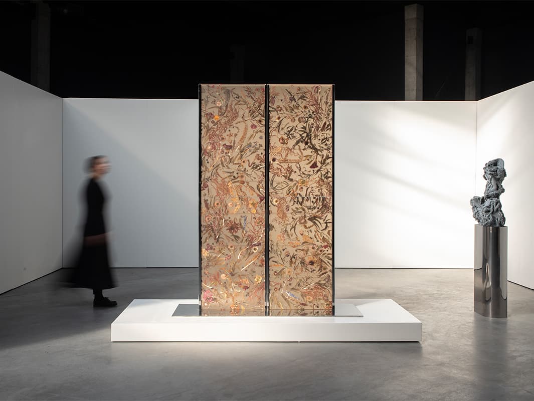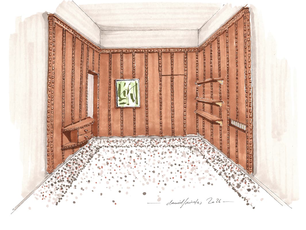 Инсталляция построена как погружение: посетитель оказывается внутри среды, которую студия создает для своих клиентов, и может считывать проект и в масштабе детали, и в масштабе архитектуры. Работы из частной коллекции усиливают разговор между искусством и поверхностью: De Natura Deorum (2013) Карлоса Айреса, NYC Contemporary Ballet (1980) Роберта Мэпплторпа и анонимное «Благовещение» XIX века в золотой раме.