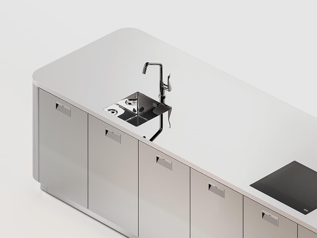 Главная новинка – Kora, кухонный остров авторства Антонио Читтерио, который выстраивает принципиально иную формальную логику: никаких прямых углов, только плавные кривые. Изогнутый остров возникает в пространстве почти как скульптура – его синусоидальные линии обеспечивают непрерывность поверхностей и позволяют вписывать кухню в помещение без жесткой привязки к ортогональной сетке. Читтерио называет отправной точкой понятие khôra из философии архитектуры – пространство возможностей, из которого рождается форма.