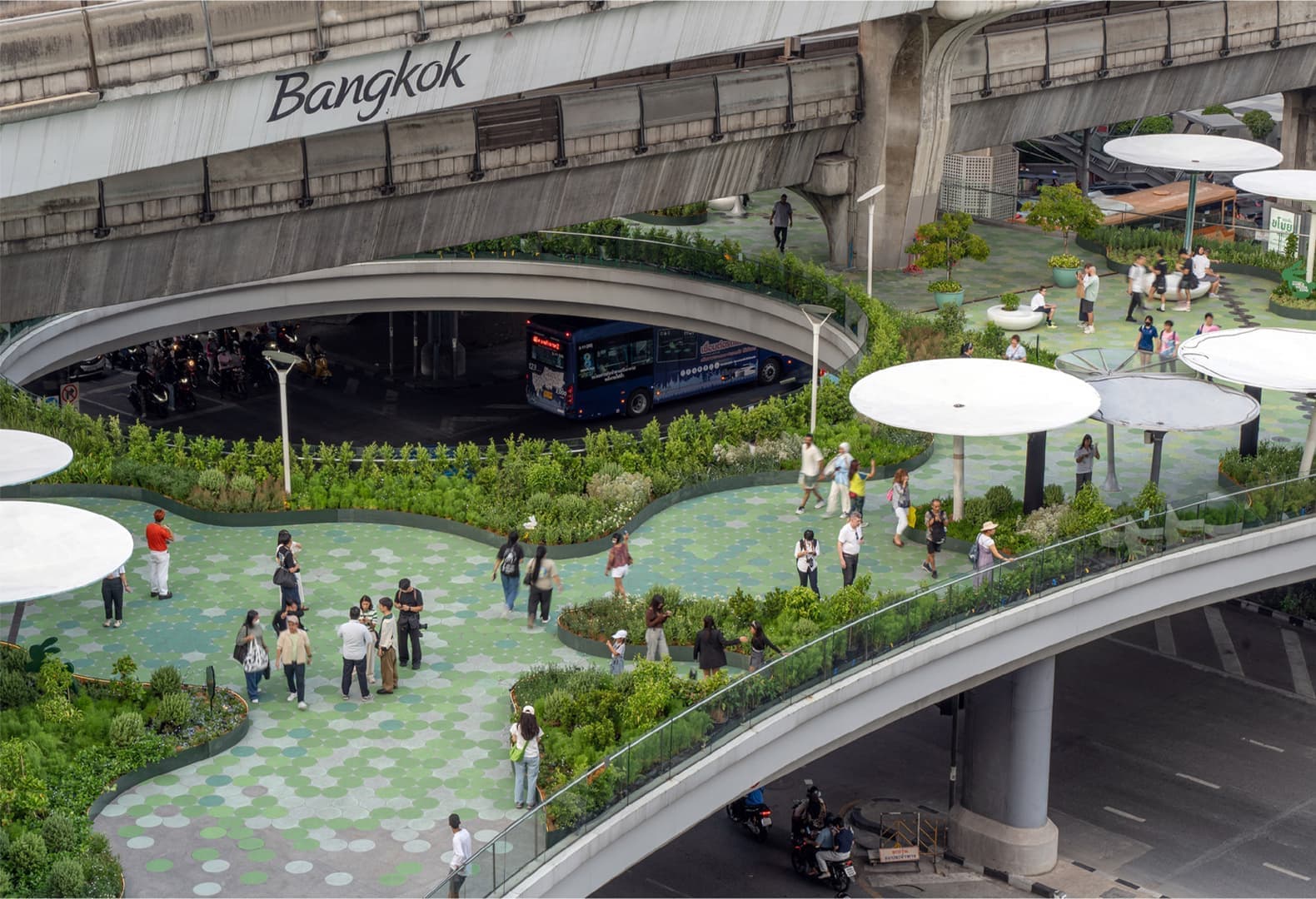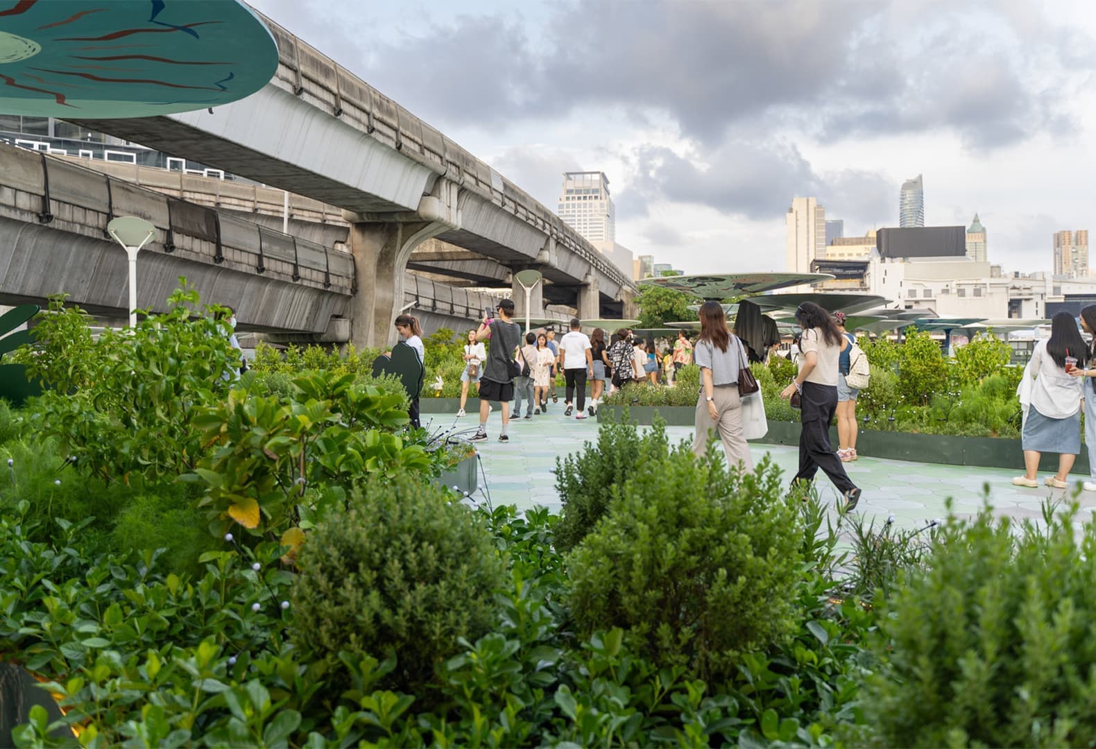 Название проекта Hop Park (от англ. hop — «прыгать») воплощает его главную характеристику — возможность легко перемещаться и адаптироваться к разным территориям. Бангкокские архитекторы Shma Company Limited придумали концепцию пространства, которое минимально изменяет первоначальную структуру участка и таким образом позволяет оперативно решать проблему отсутствия озелененных территорий и мест для отдыха в больших городах. Hop Park примыкает к оживленной транспортной развязке и, по задумке команды, замедляет ритм жизни в этом районе и создает приятную обстановку для местных жителей. Территория разделена на пять зон, каждая из которых включает в себя около 20 000 деревьев и призвана привнести частичку природы в мегаполис.