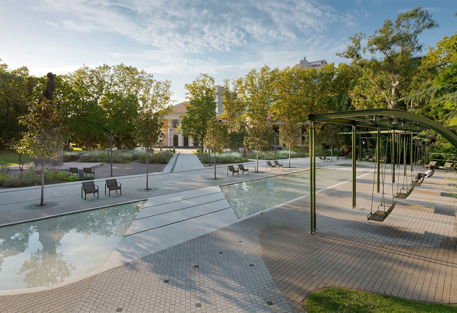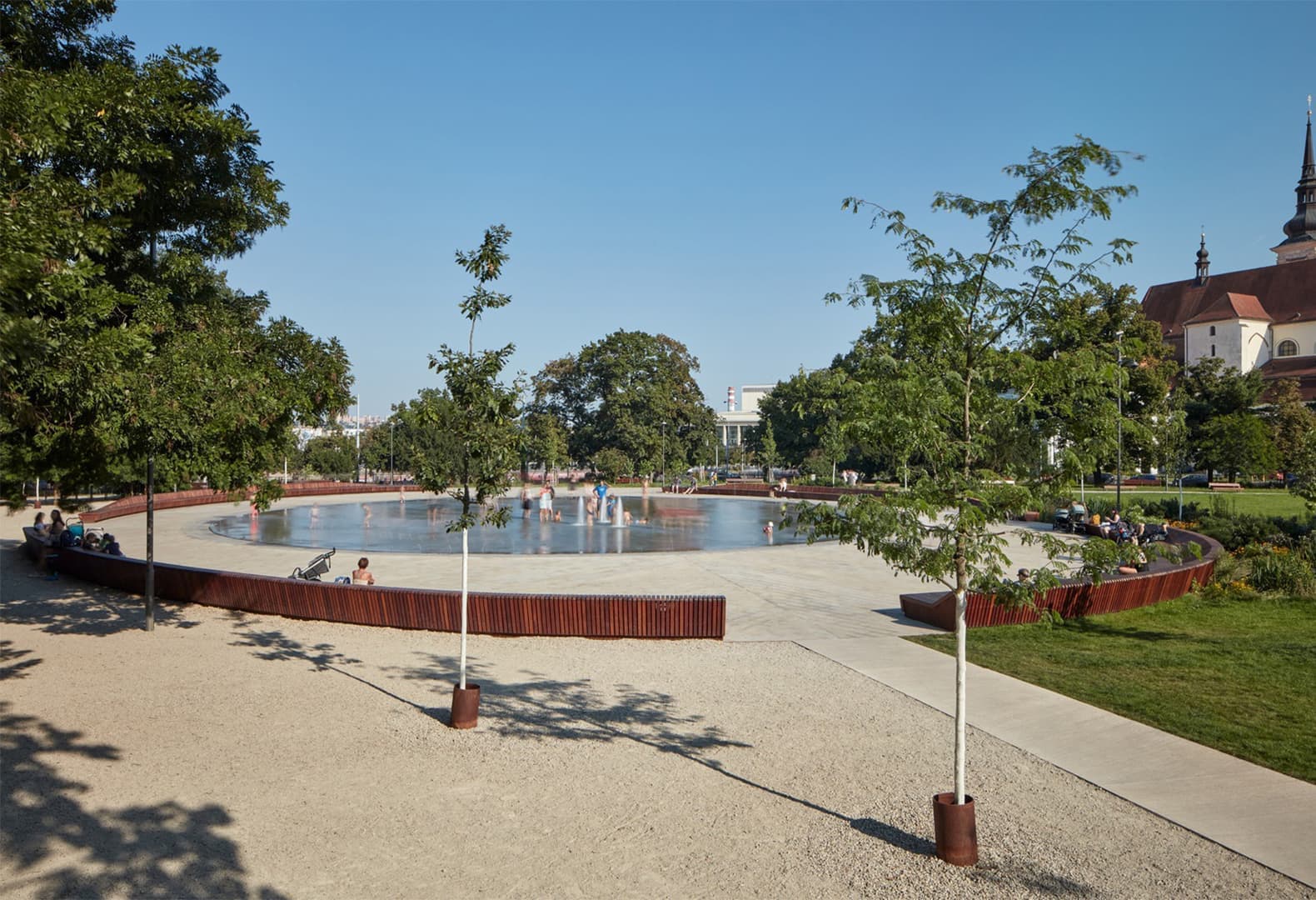 Команда локальных архитекторов обновила открытое общественное пространство в историческом центре Брно, превратив его в оживленный парк, отвечающий запросам современного городского жителя. Главным композиционным элементом проекта стала центральная площадь, которую студия CONSEQUENCE FORMA называет «городской ареной». Здесь расположен фонтан, окруженный четырьмя изогнутыми скамьями, — вместе они образуют кольцеобразную форму, транслируя ощущение безопасности и безмятежности. Также в обновленном пространстве появились детская площадка и кафе: последнее по задумке архитекторов служит связующим звеном между городским и зеленым ландшафтом. Кроме того, к нему примыкает небольшая площадка для проведения мероприятий, что делает место еще более привлекательным для посетителей.