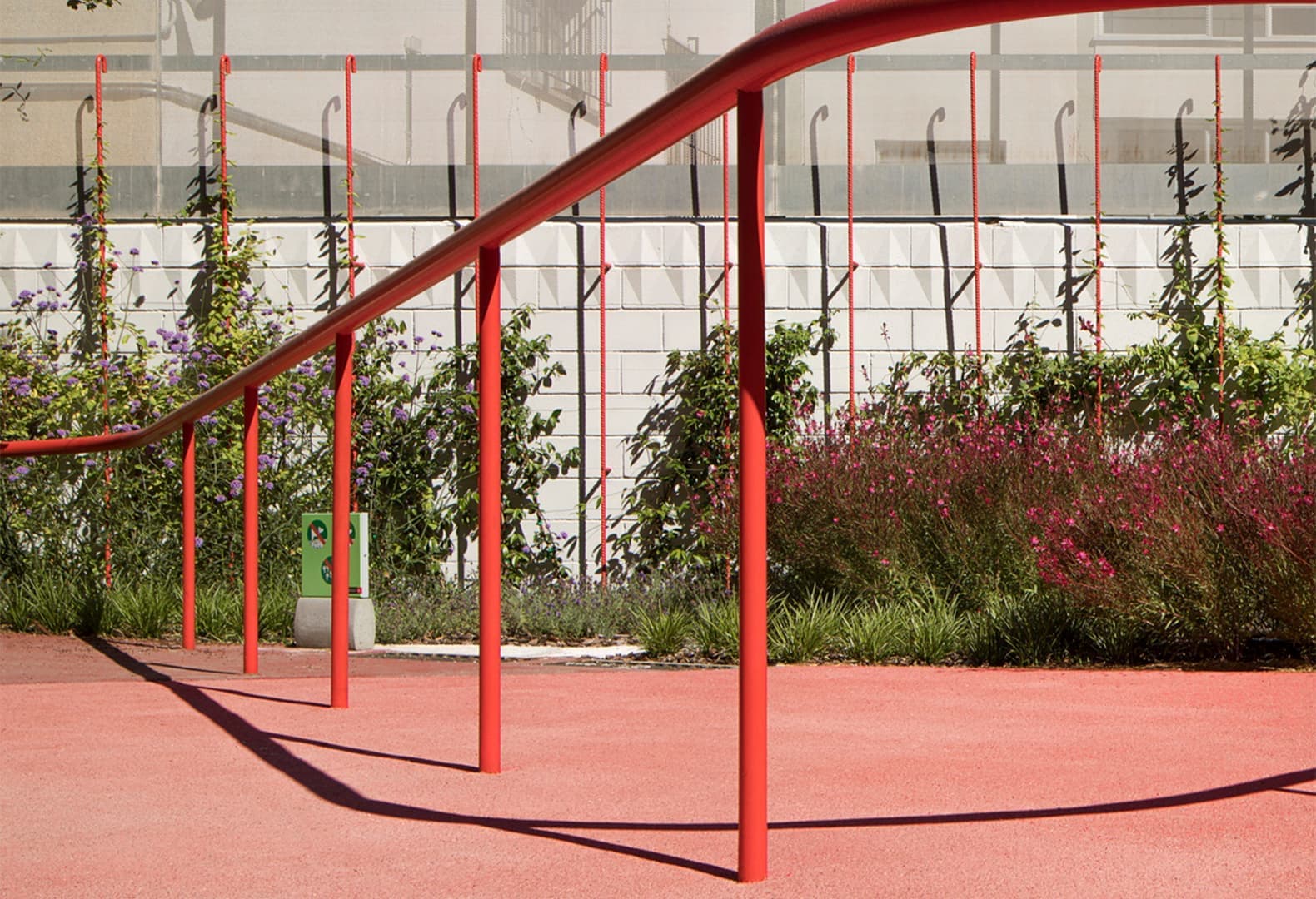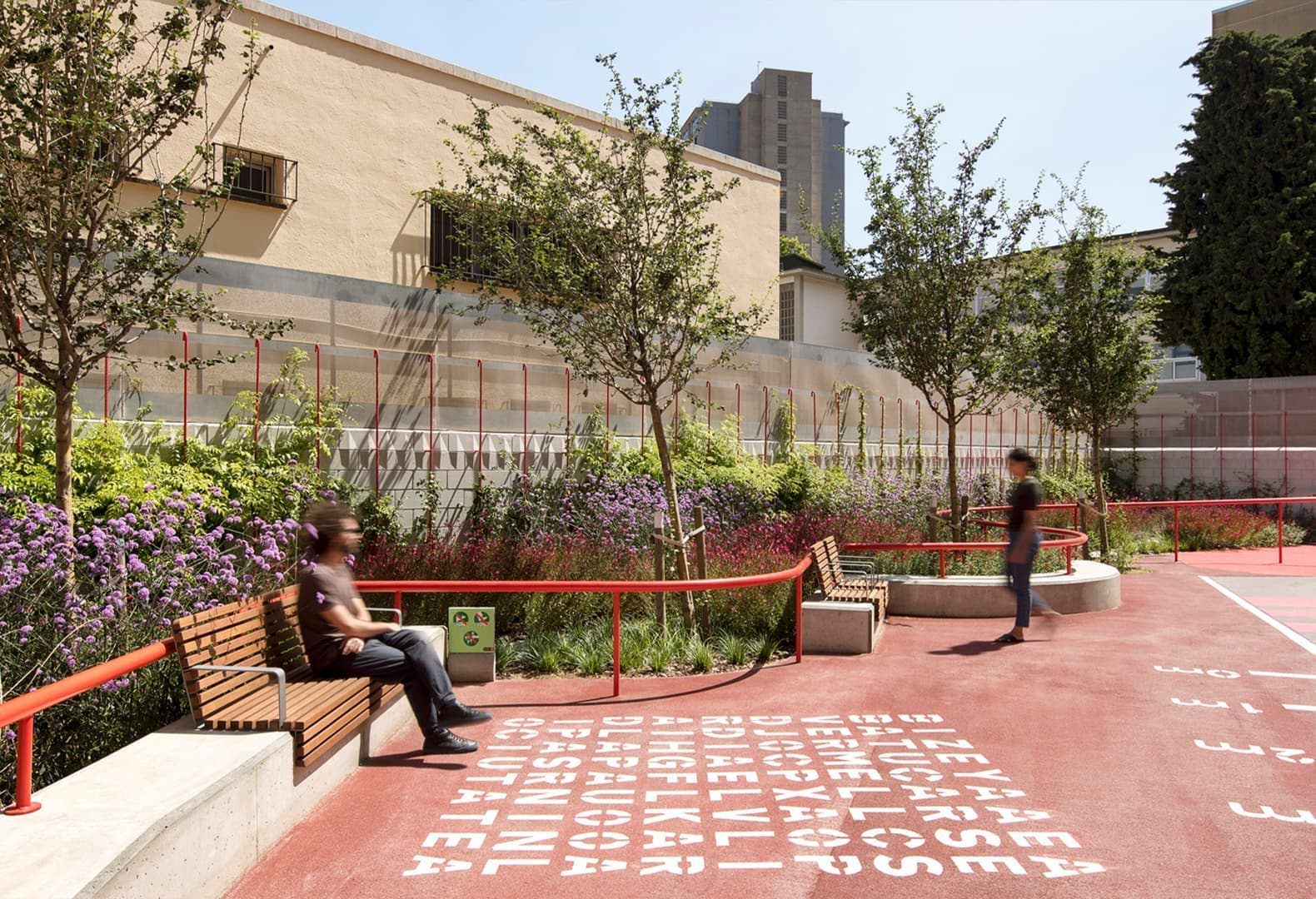 Пространство по проекту барселонской студии расположено напротив местной школы. Главной задачей команды стало оживление некогда заброшенной площади при помощи игривого переосмысления городских элементов и создания новых точек доступа к образовательному учреждению. Так, основными инструментами архитекторов для создания динамичного пространства, поощряющего общение и активное взаимодействие, стали озелененные зоны, мощеные дорожки и нестандартные объекты — например, места для сидения в виде массивных сфер. Посетителям площади предлагается пройти так называемый игровой маршрут: он начинается у любого из входов на площадь, продолжается по периметру с яркими извилистыми периллами и завершается спиралевидной скамьей в центре пространства.