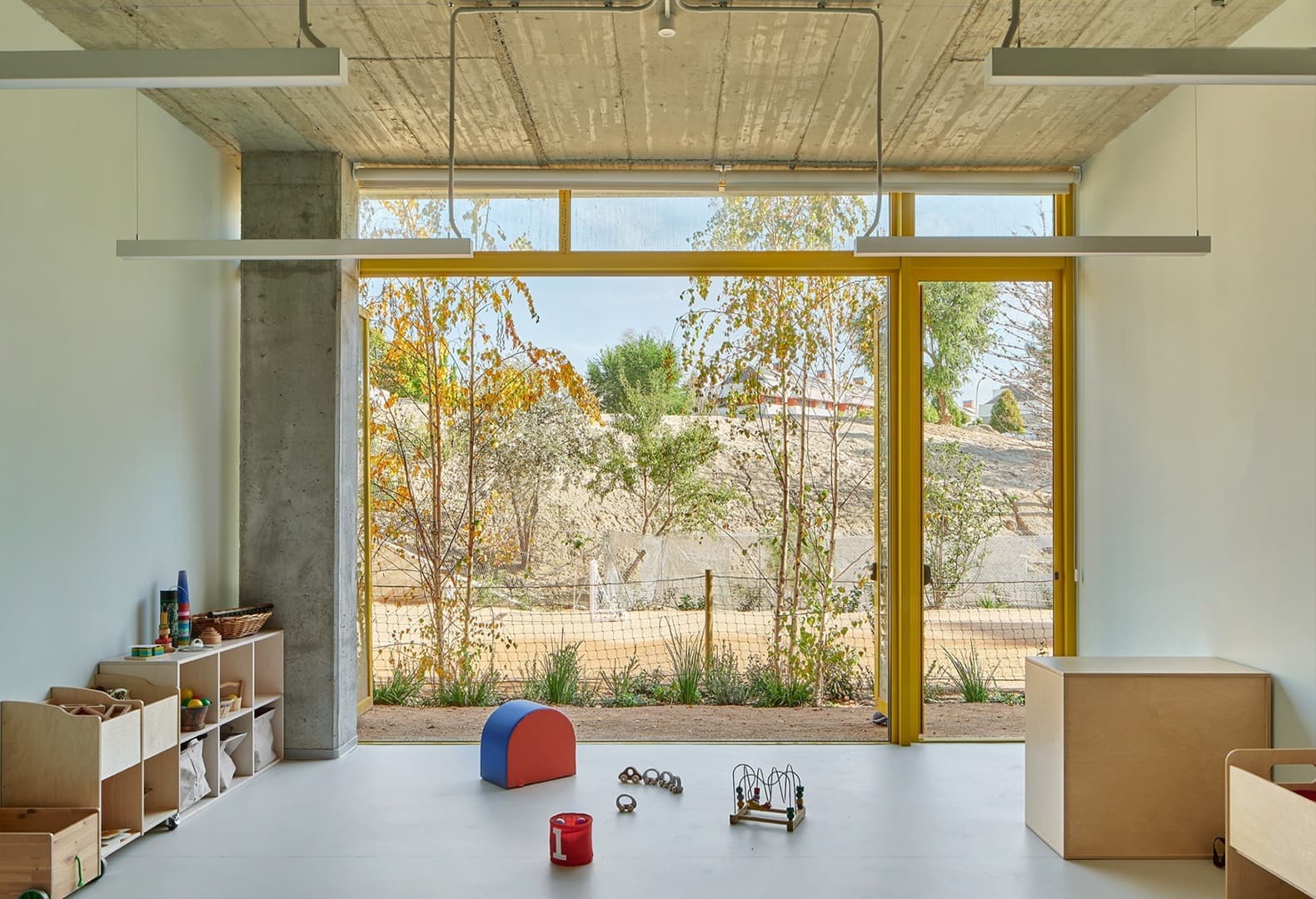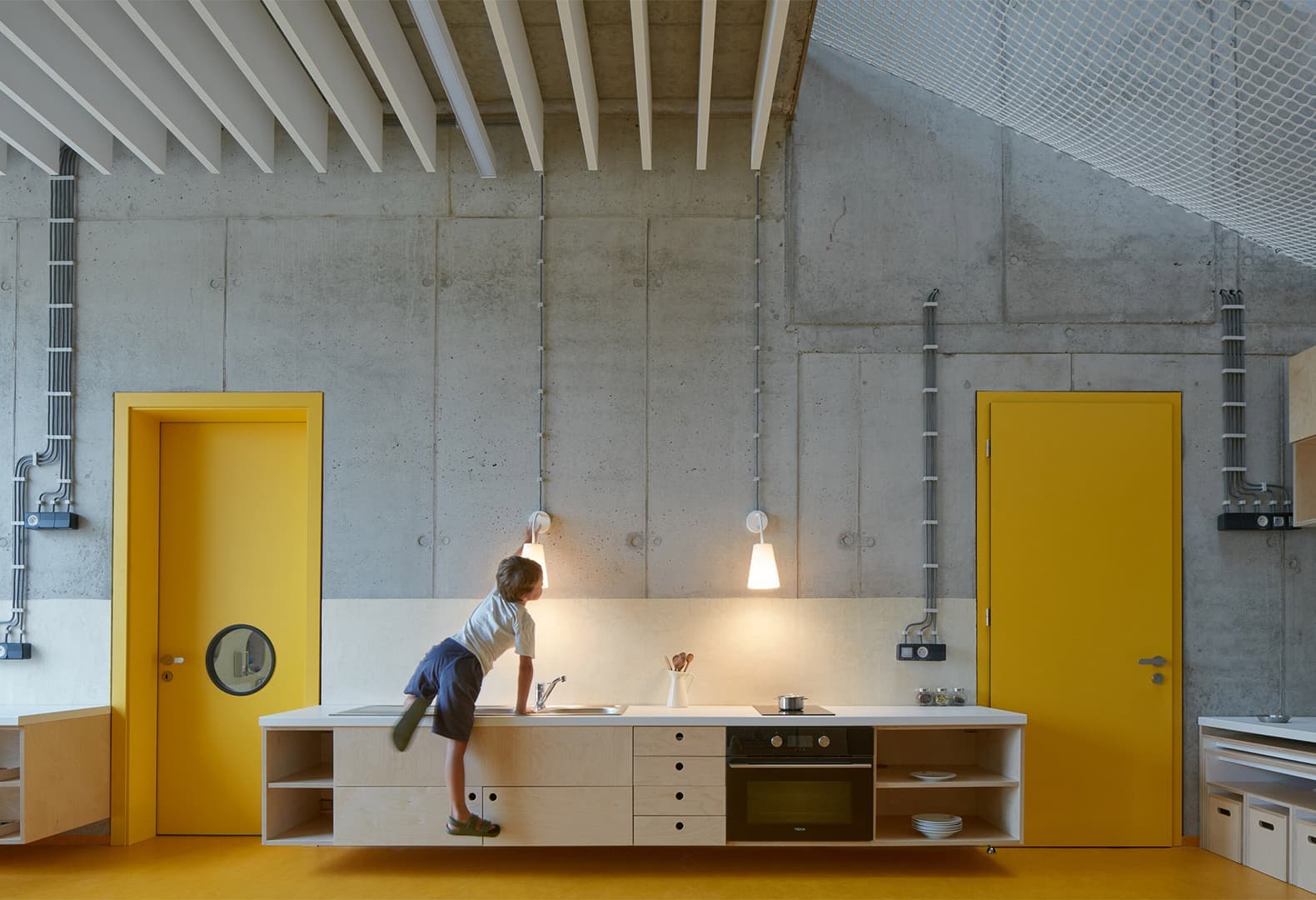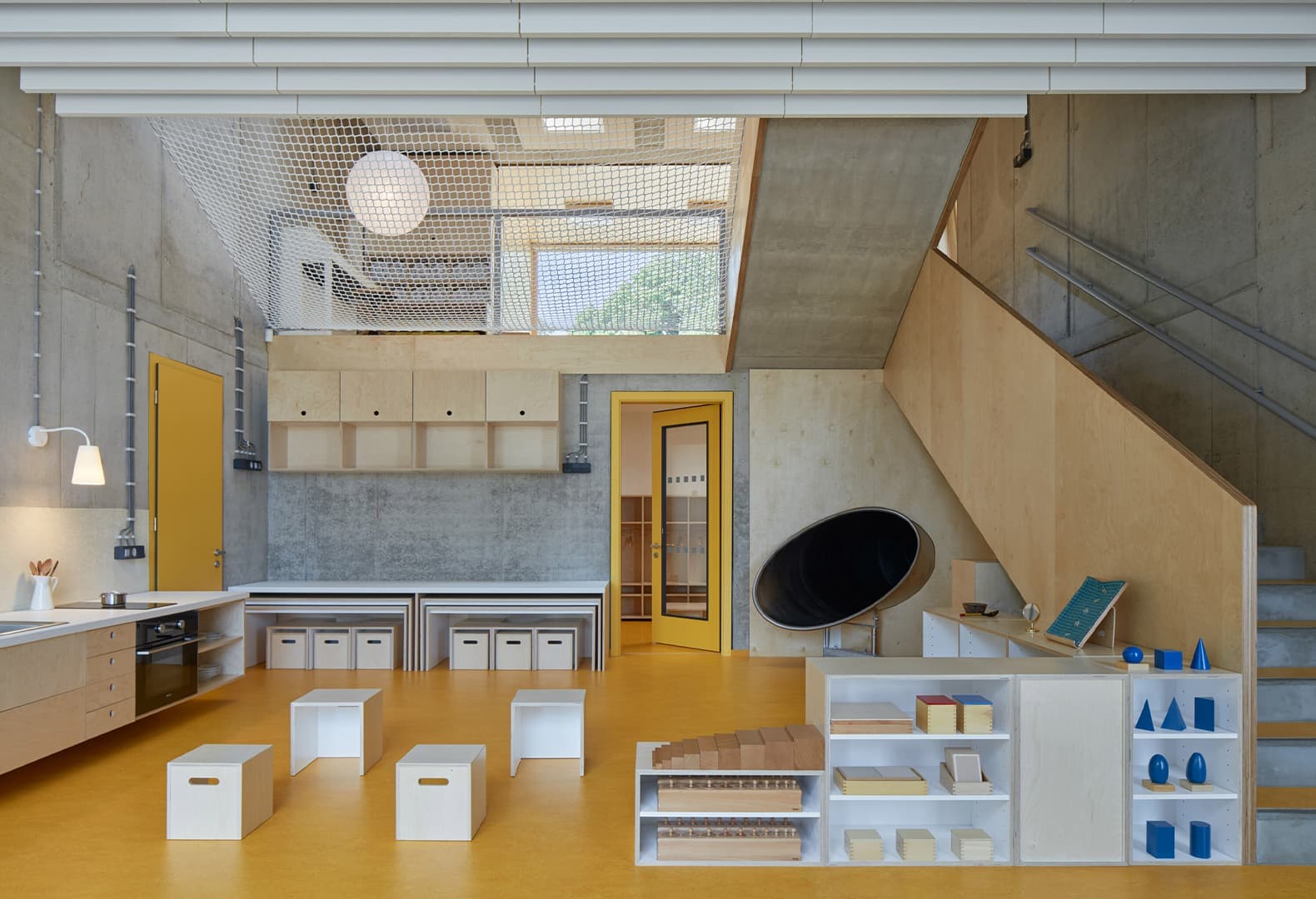 При работе над этим проектом основатель пражской студии Mjölk Architekti Ян Мах проанализировал собственные воспоминания о детском саду и представления о том, какую роль это пространство играет в жизни маленького ребенка. Команда реконструировала существующее здание XX века и связала его с новым при помощи открытой игровой площадки. Пристройка выполнена в виде геометрического объема, который повторяет пропорции главного сооружения. По задумке авторов проекта, планировка внутренних помещений направлена на поощрение самостоятельных исследований. Кроме того, промежуточные зоны между этажами имеют свою атмосферу и форму, чтобы по-разному стимулировать творческое мышление. В палитре материалов необработанный бетон сочетается с ярко-желтым линолеумом и березовой фанерой.