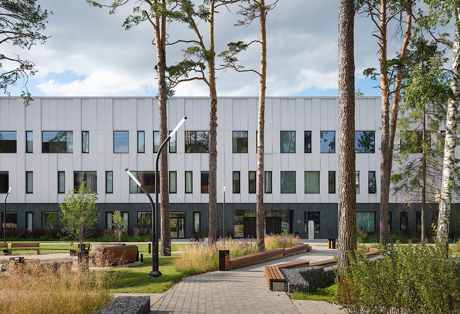 В рамках проекта кампуса Физико-математической школы НГУ в Академгородке бюро AI Studio предусмотрело несколько самостоятельных корпусов: учебный блок с классами, лабораториями и административными помещениями, рекреационный центр со спортивным и актовым залами и библиотекой, а также строящиеся общежития. За интерьеры отвечала компания EdDesign, которая сделала акцент на гибких и функциональных решениях для разных сценариев обучения, от индивидуальной работы до проектных исследований и коллективных обсуждений. Внутренние пространства спроектированы таким образом, чтобы в них попадало большое количество естественного света и сохранялось ощущение открытости. Согласно концепции, натуральные материалы и сдержанная цветовая палитра усиливают ощущение связи между зданиями и окружающим лесом.