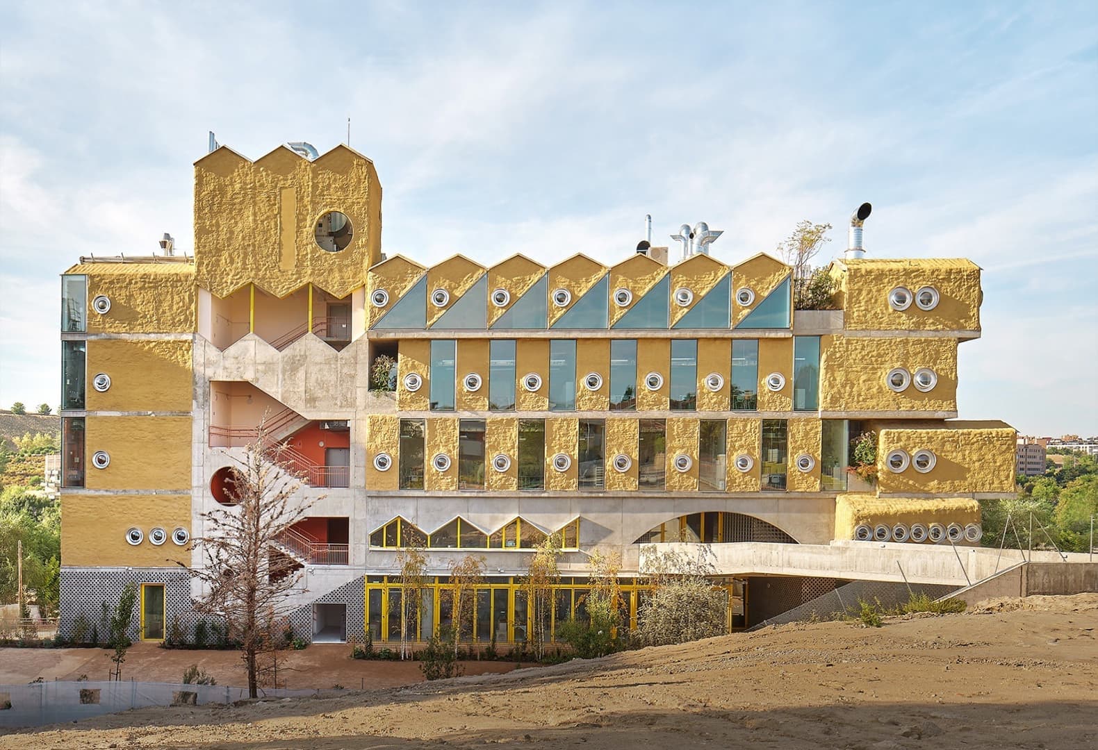 В проекте мадридской частной школы Reggio School основатель студии Office for Political Innovation (OFFPOLINN) Андрес Жак опирался на идею о том, что архитектурная среда может пробуждать в детях тягу к исследованиям. Здание задумано как вертикальная последовательность и состоит из нескольких уровней: от нижнего, рассчитанного на самых маленьких учеников, до верхнего, где занимаются студенты старших классов. С помощью такой пространственной организации архитекторы предлагают ученикам самостоятельно и в компании сверстников исследовать многогранную экосистему школы. Помимо внутреннего сада, в школе есть центральная площадь — место, где можно проводить уроки, собрания и мероприятия, а также заниматься спортом.