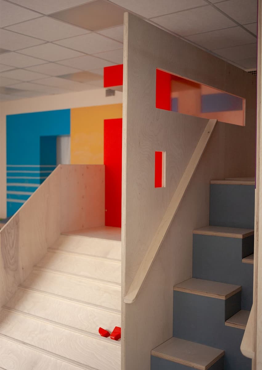 Главной задачей команды екатеринбургского бюро Zavod11 под руководством Ирины Потаповой стало создание пространства, которое бы способствовало развитию эмоционального интеллекта и экологичному отношению ребенка к миру. На 300 квадратных метрах архитекторы разместили места для конструирования, игр, театра, занятий спортом и творческих секций, а для зонирования использовали простые геометрические формы, отсылающие к авангарду. Спокойную палитру оформления оживляют свежие желтые и коричневые акценты, вдохновленные ярким оперением птички овсянки. Для пола в игровых помещениях использовано ковровое покрытие — по задумке команды, оно стимулирует тактильные ощущения.