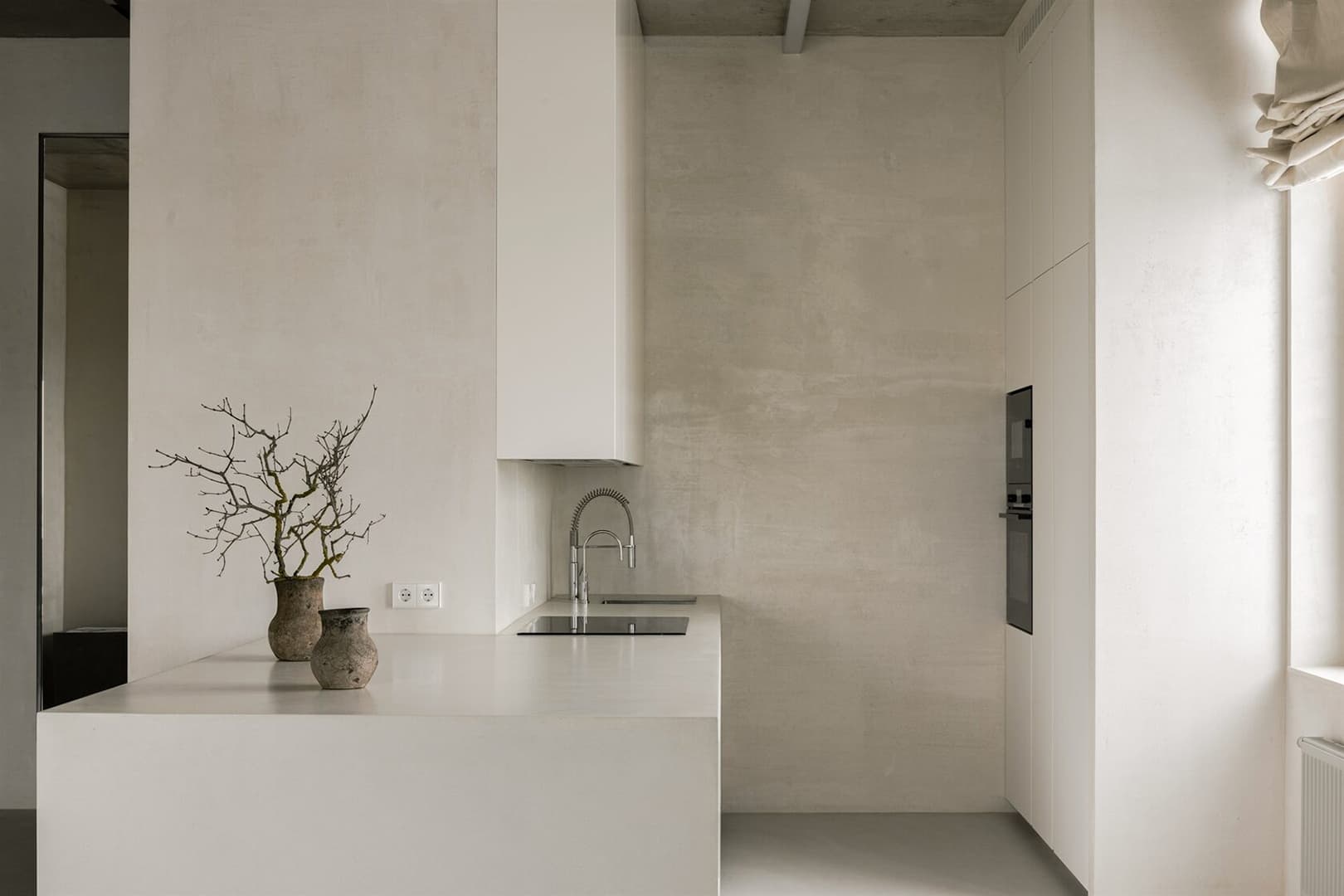 При работе над такими интерьерами для меня ключевым моментом всегда остается оттенок белого. Я принципиально использую исключительно теплые тона. Идеальный вариант — фактурная штукатурка вместо гладкой краски: она сразу делает пространство более глубоким и визуально живым.