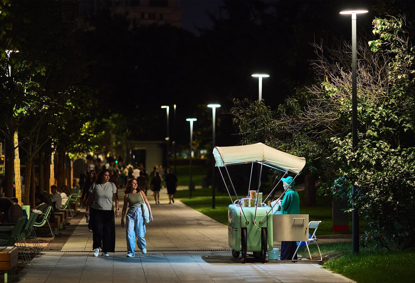 Значительная часть территории оставлена в темноте, что сохраняет естественный ритм ландшафта и позволяет избежать ощущения «пересвеченного» парка.