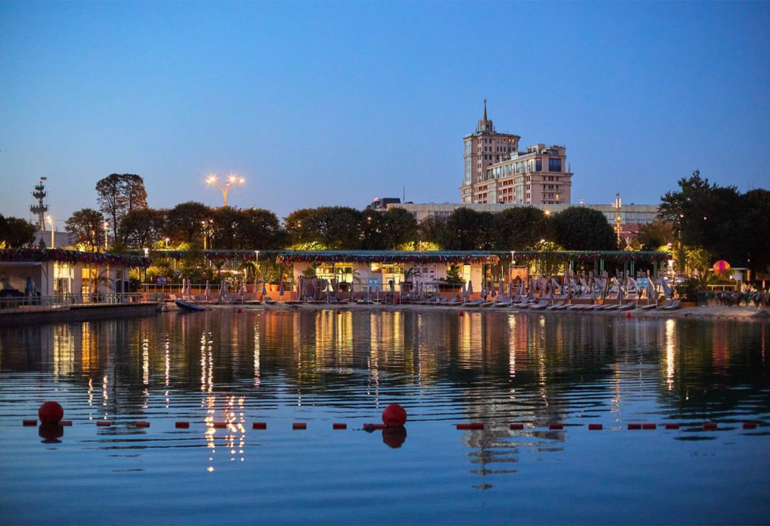 Особую роль играет вода: отражения становятся самостоятельным визуальным слоем, где световые блики, архитектура и силуэты деревьев читаются как продолжение композиции, усиливая глубину и создавая ощущение цельности среды. Вечером пространство не теряет выразительности, а становится камерным и созерцательным.
