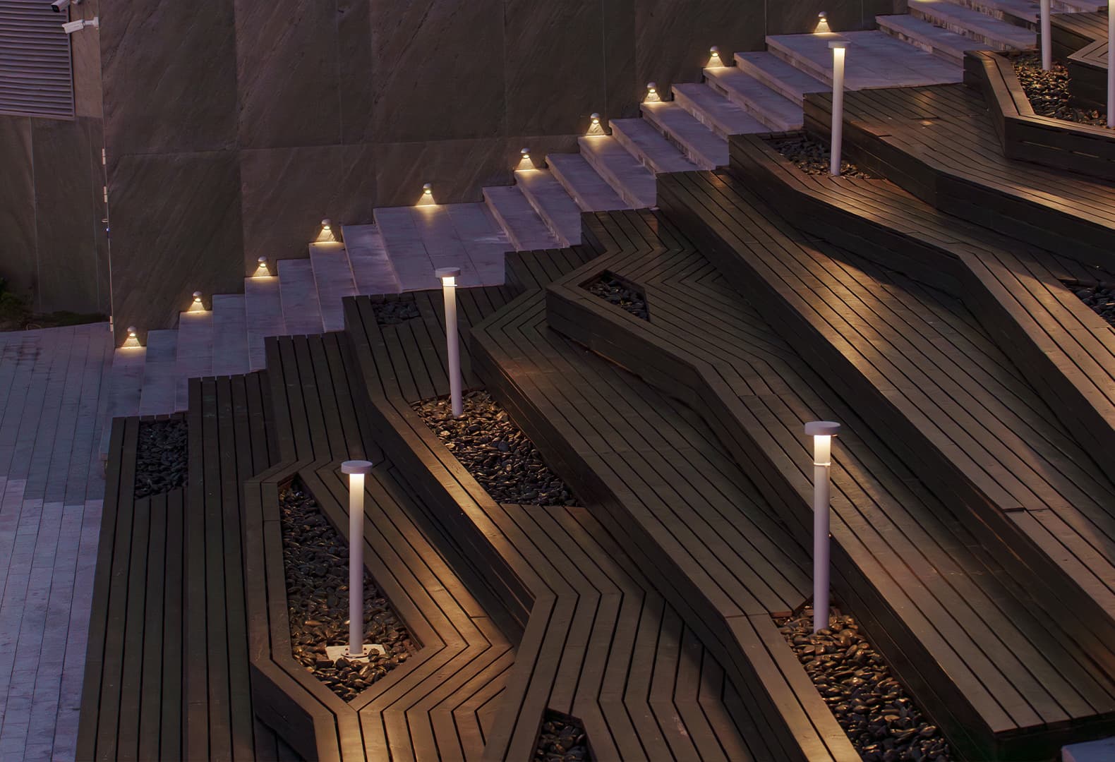 В такой среде свет подчеркивает структуру пространства, создавая гармоничное взаимодействие архитектуры, ландшафта и человека.