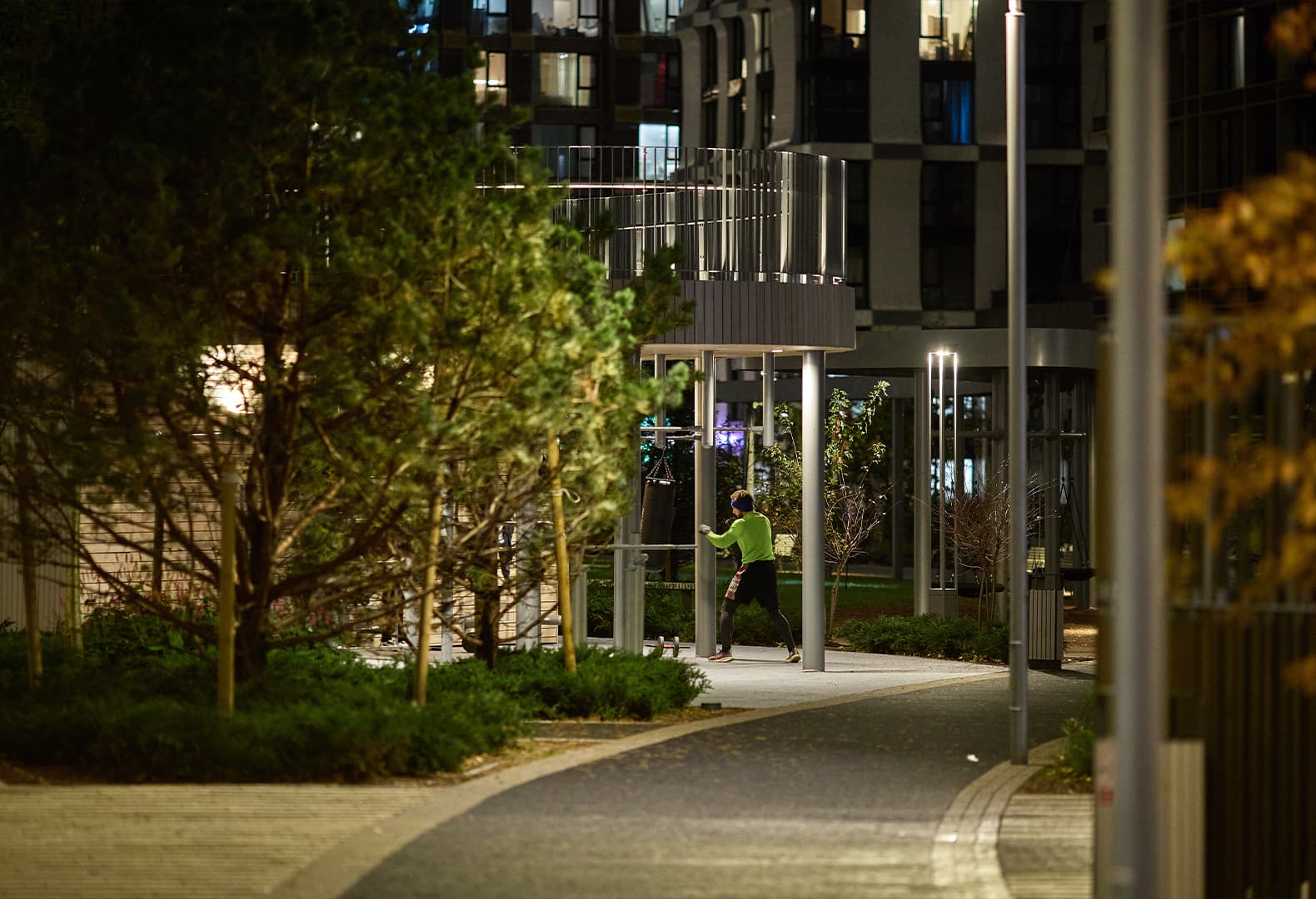 В жилых комплексах свет одновременно организует движение, выделяет входные группы и дворы, формирует приватность и комфорт, обеспечивая безопасность. Например, вторая очередь ЖК «Метрополия» по проекту бюро UTRO демонстрирует подход, где свет подчеркивает архитектурные и ландшафтные решения без лишней декоративности. Минималистичные светильники создают ровную, спокойную атмосферу, а проекции на газоне центральной поляны, имитирующие мерцание солнечных бликов, формируют визуальные акценты, читаемые с верхних этажей и на уровне двора, создавая характерную атмосферу «духа места». Тщательные расчеты освещенности и настройка приборов исключили слепящий эффект, обеспечив равномерное покрытие функциональных зон и ненавязчивые акценты на малых архитектурных формах.