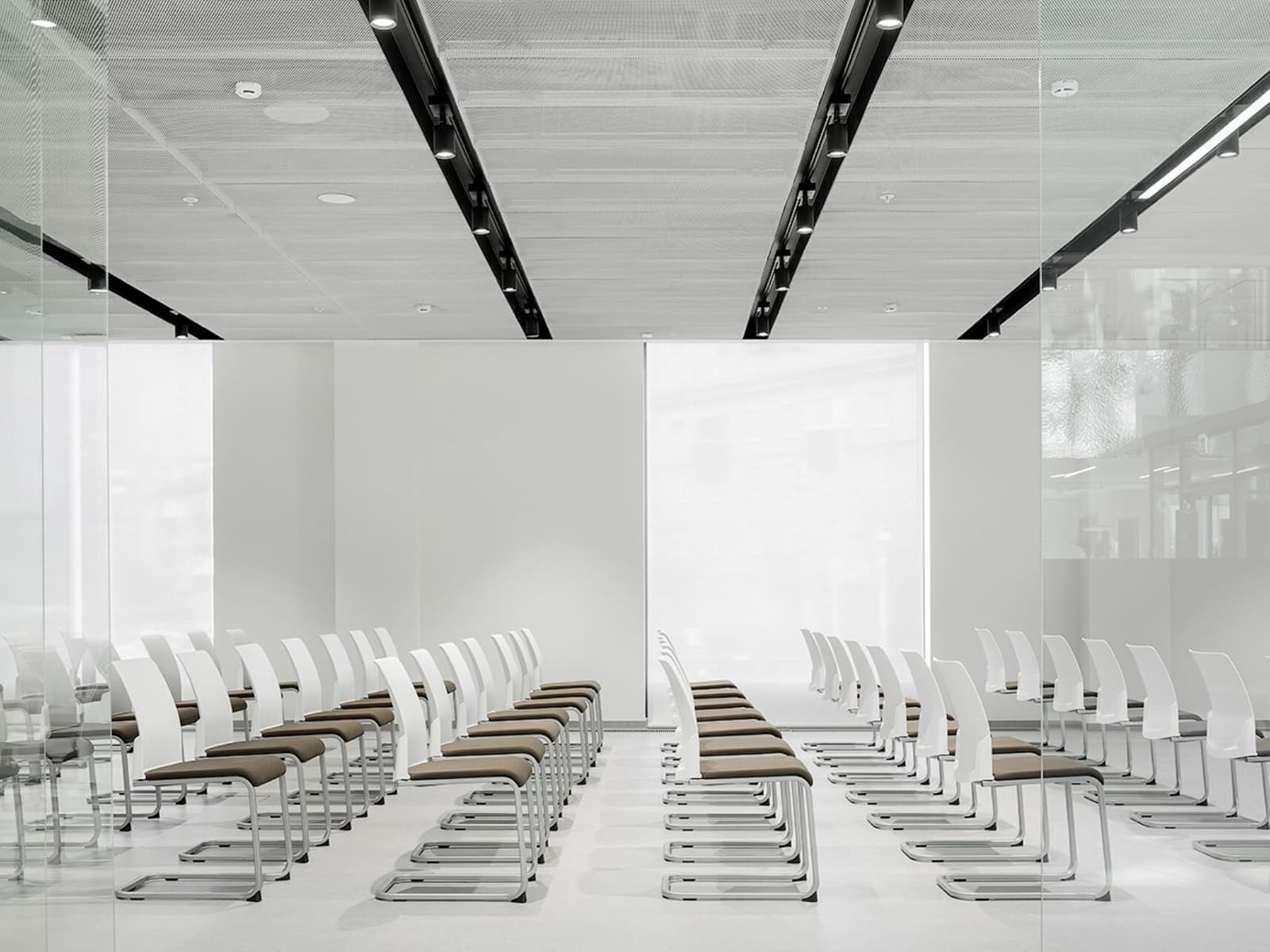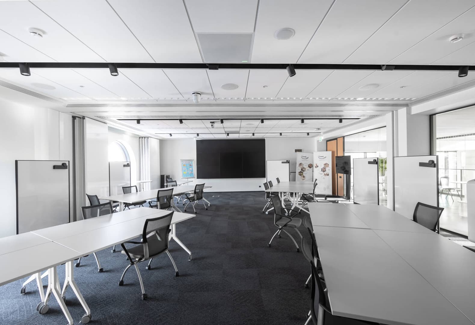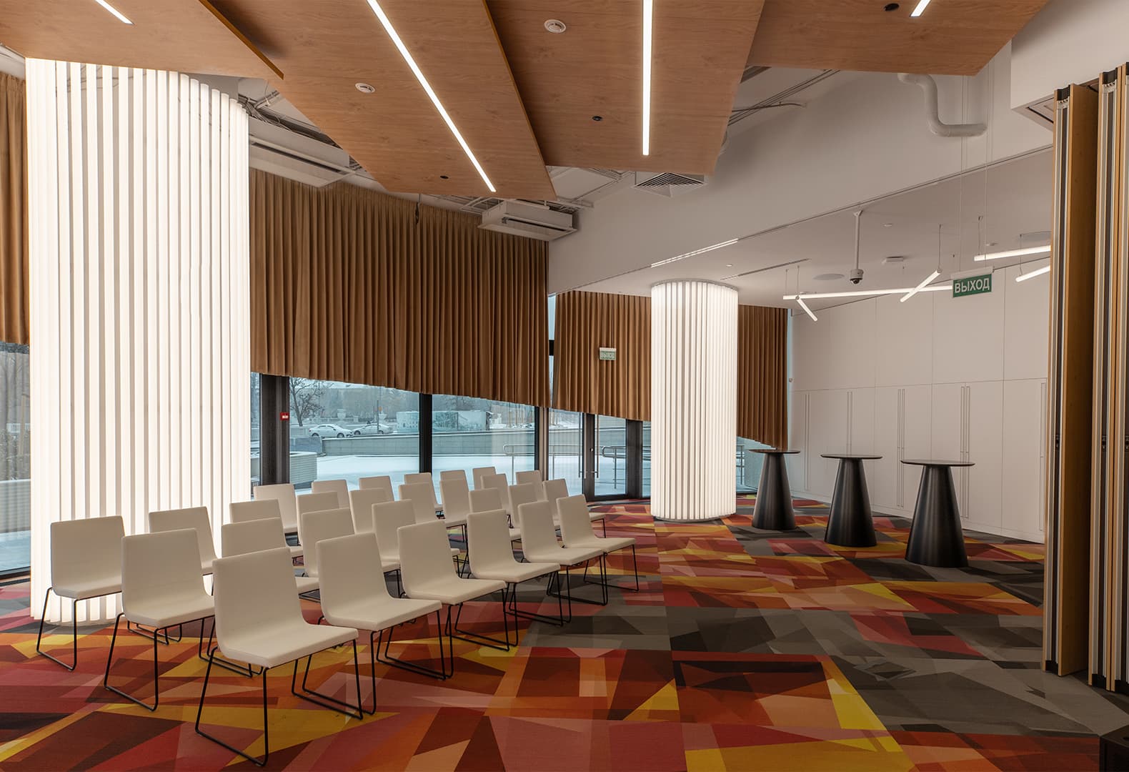 - Универсальные залы и трансформируемые переговорные. Это залы с гибкой планировкой, где за счет использования трансформируемых перегородок и модульной мебели можно проводить как небольшие семинары, так и крупные лекции и презентации.