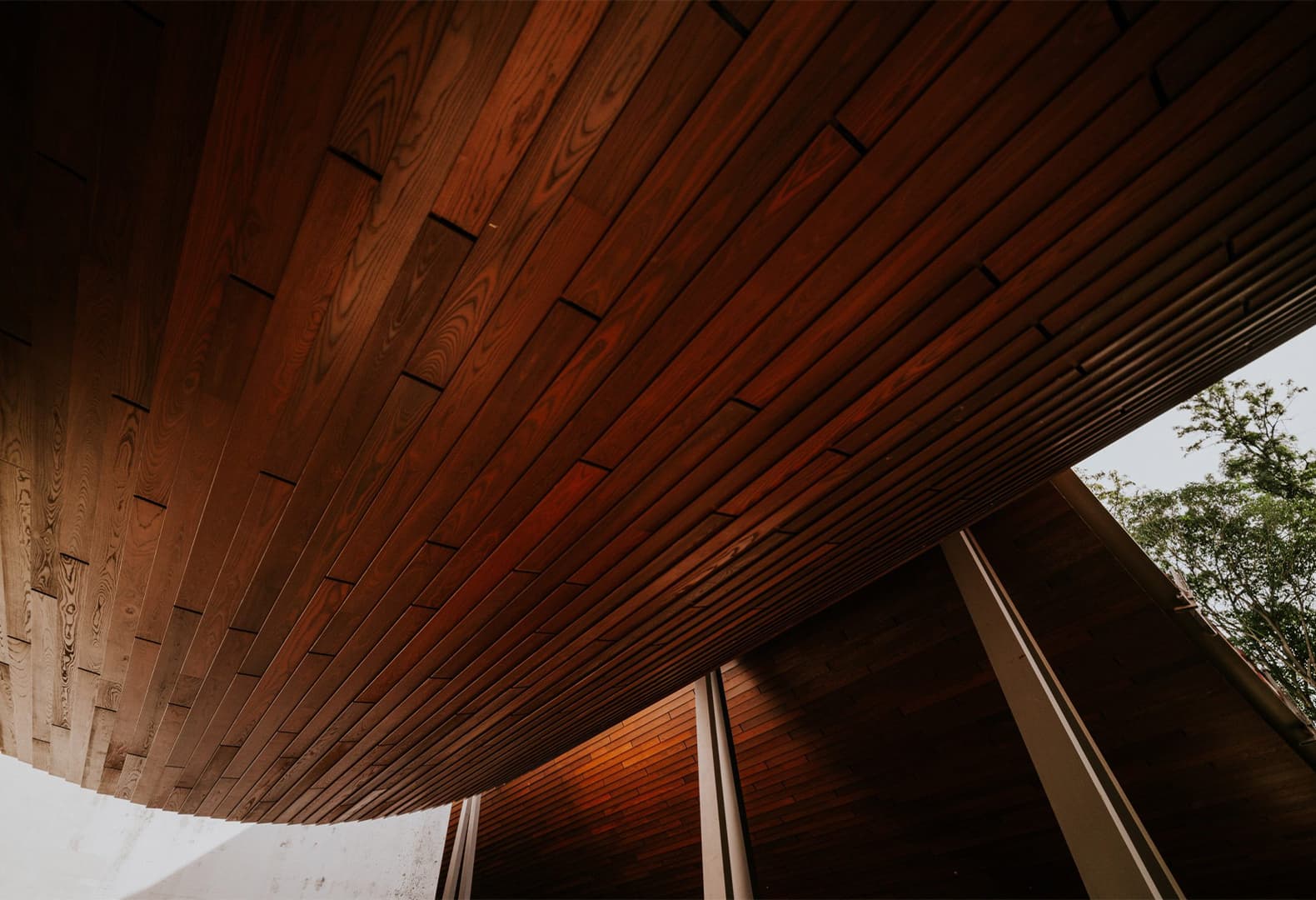 Как и в случае многих своих проектов, на создание этой архитектурной детали Кенго Кума вдохновили традиции родной страны. В частности, изогнутый 100-метровый навес отсылает к типичной типологии Engawa — полуоткрытой дорожке с нависающими над ней волнами крыши, которую можно встретить в традиционных японских домах. Эта концепция нашла отражение практически во всех элементах экстерьера и интерьера здания, что помогло создать медитативную и спокойную атмосферу для отдыха и медленного созерцания. В то же время прозрачные архитектурные объемы, позволяющие естественному свету свободно проникать внутрь помещений, подчеркивают идею CAM как открытого и доступного для каждого арт-центра.