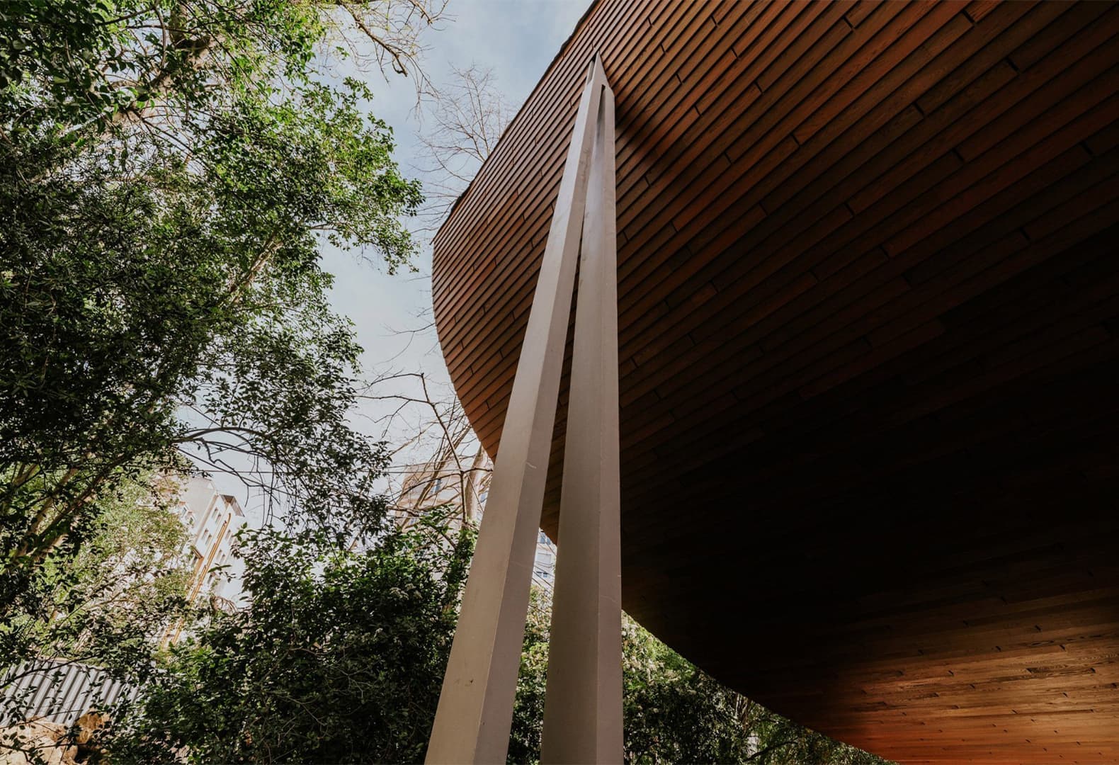 Одним из архитектурных решений, к которому команда бюро обратилась для решения ключевой задачи проекта, стал большой скульптурный навес на фасаде нового здания. Он облицован белой плиткой и отличается плавным органическим силуэтом, а также имеет вполне конкретную функцию: прежде всего эффектный элемент превращает вход в арт-центр в переходную зону, предназначенную для взаимодействия посетителей. Сверху крыша облицована керамической белой плиткой местного производства – по мнению Кумы, этот материал связывает Португалию и Японию, – а с нижней стороны отделана деревом.