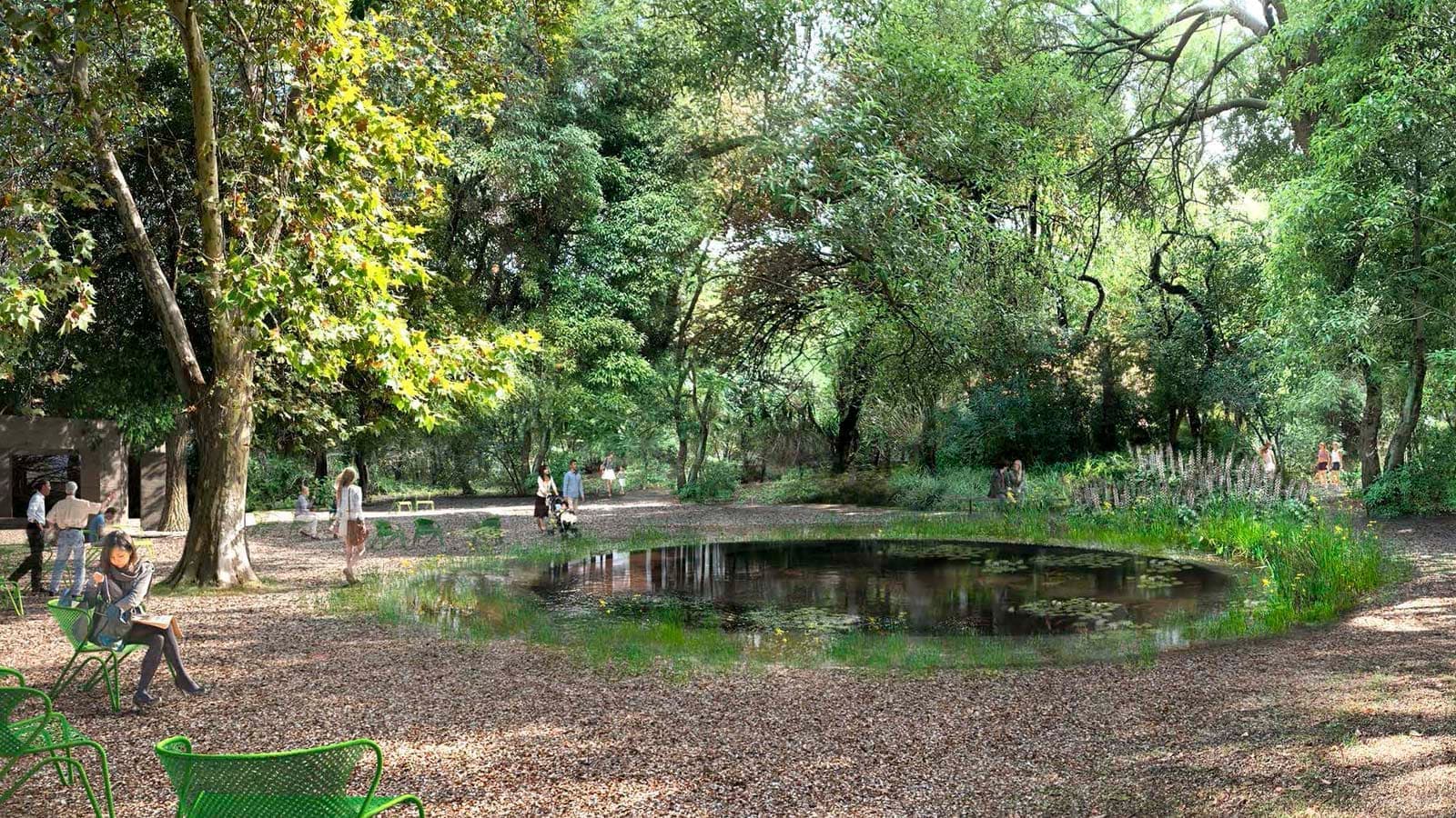 Реконструкция арт-центра стала частью более масштабной инициативы, подразумевающей и обновление сада. Эту задачу фонд доверил бюро из Ливана под руководством Владимира Джуровича, который опирался на видение авторов первоначальной концепции пространства, Гонсало Рибейру Теллеса и Антониу Виана Баррето. В свое время они решили сделать акцент в саду только на местных растениях. Джурович обратился к идее архитектурного дуэта, основанной на демонстрации разнообразного португальского ландшафта, а также его экологических и культурных проявлений. Получившуюся среду команда фонда называет «городским лесом», который задает новый вектор развития зеленой территории в южной части комплекса. В результате расширение сада, представляющее собой устойчивый ландшафт с высоким уровнем биологического разнообразия, позволяет людям чувствовать себя ближе к природе и создает среду обитания для диких животных. К существующим насаждениям команда добавила новые элементы, включая извилистые дорожки, ведущие прямо к зданию CAM и существующему саду, местные растения и деревья: многие были собраны в дикой природе и выращены в питомнике непосредственно перед посадкой.
