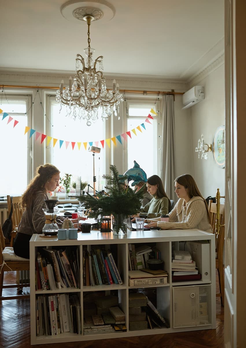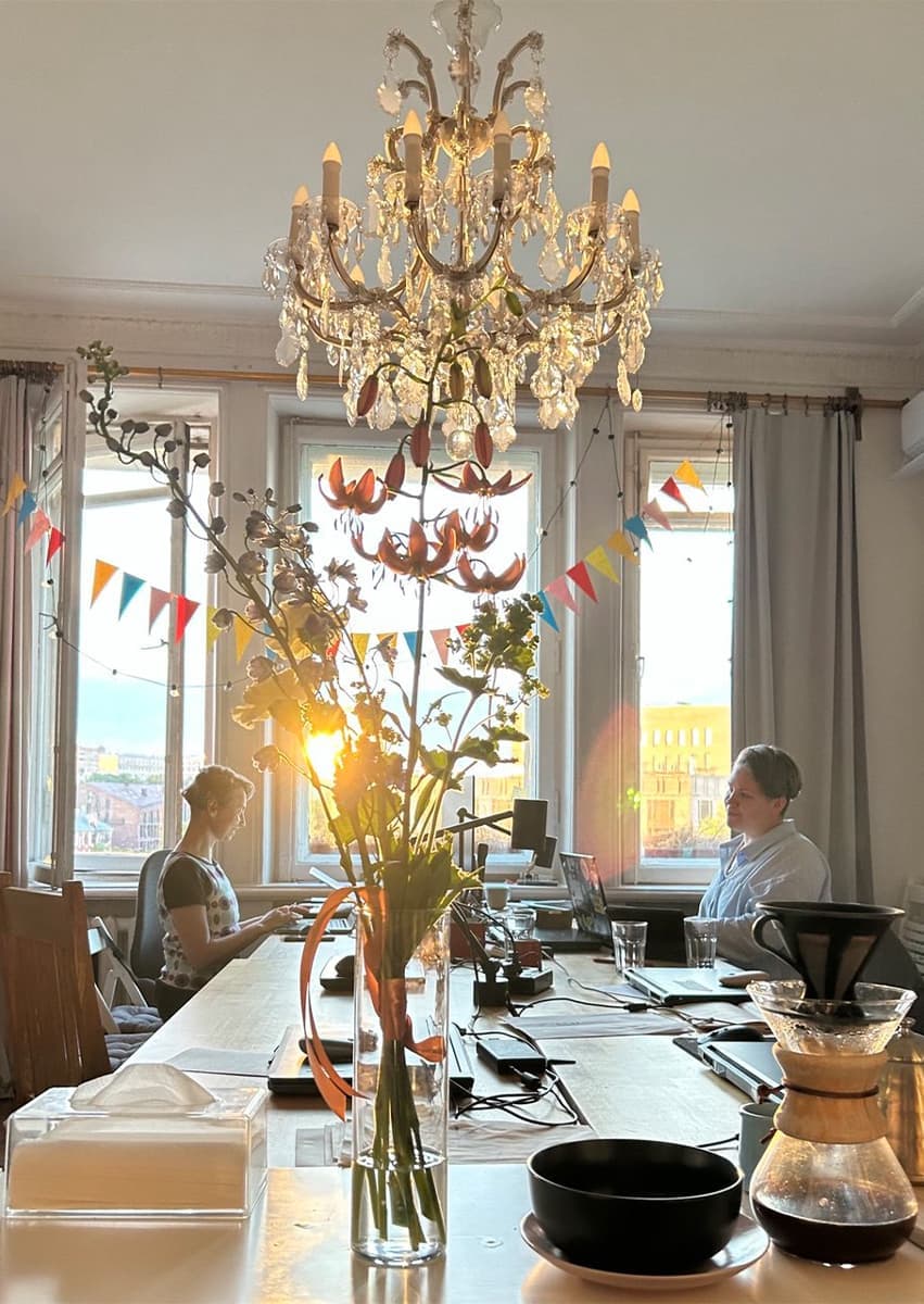 Рабочий день в бюро UTRO обычно начинается с заваривания кофе. Команда собирается за большим столом, общается и заряжается настроением. Мы ценим атмосферу и эстетику пространства, поэтому у нас в офисе всегда есть цветы, которые наполняют помещения своим ароматом.