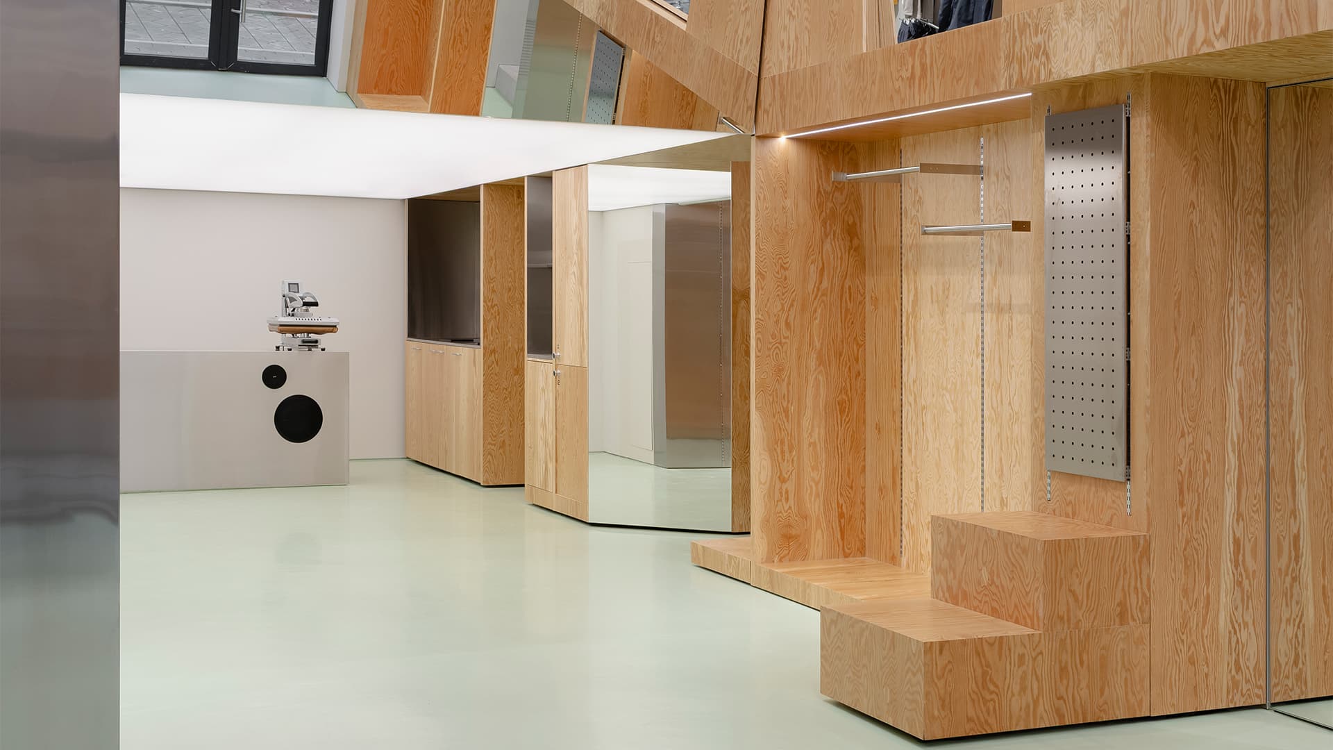Хвойная фанера, металл и зеркала в интерьере магазина для бегунов — проект бюро .dpt