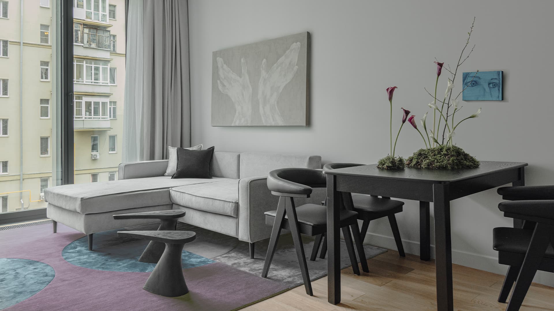 Базовая серая палитра и точечные акценты в интерьере квартиры для сдачи в аренду — проект студии «Точка дизайна»