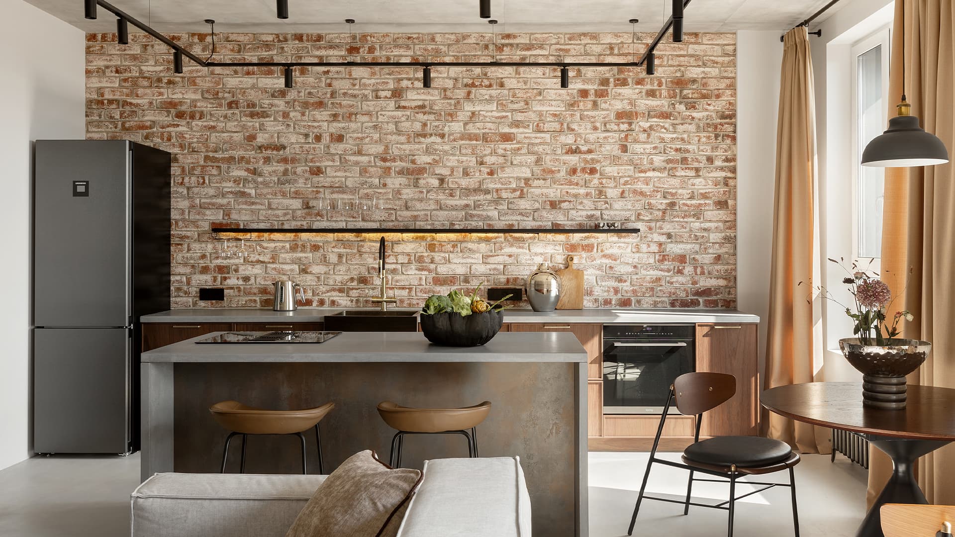 Кирпичная кладка и бетон в интерьере квартиры для молодой пары — проект Анастасии Петуховой